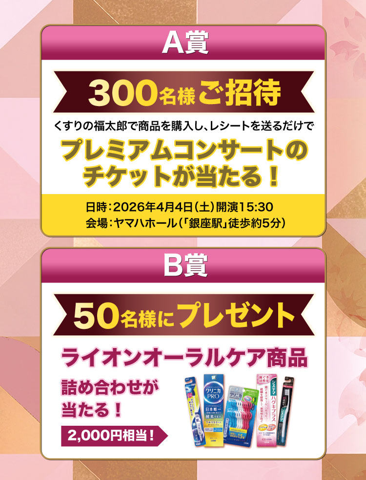 - くすりの福太郎でご購入いただいたレシート500円(税込)につき、1口のご応募とさせていただきます。